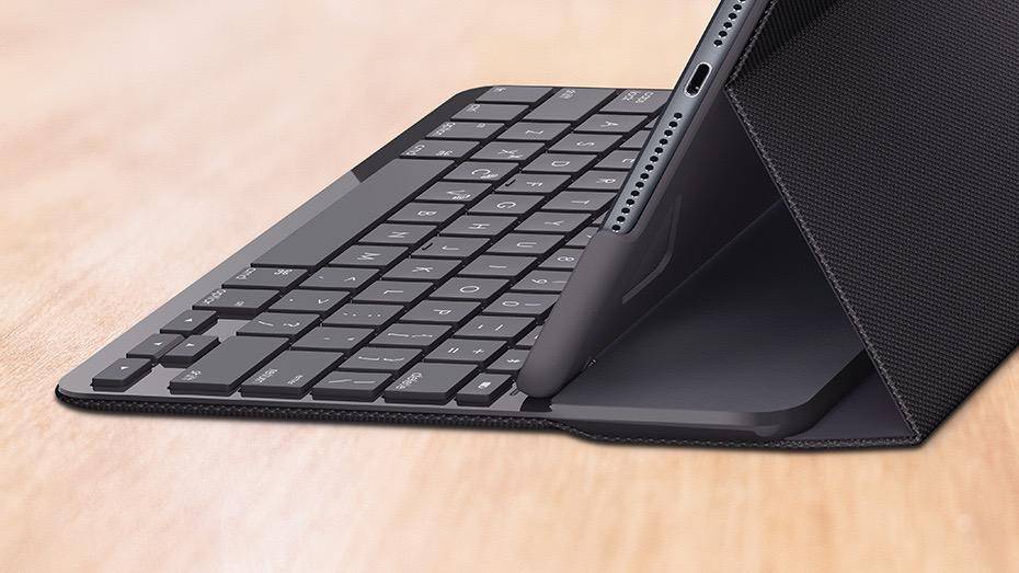 Bàn phím Logitech Slim Folio iPad Gen 7 có khe cắm bút gọn gàng không sợ rơi hoặc thất lạc